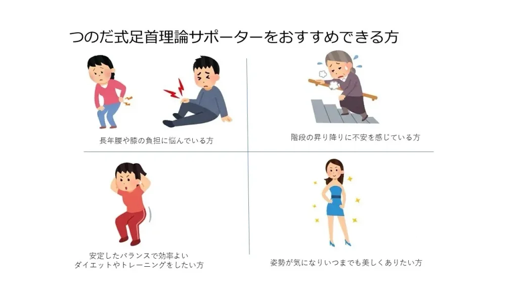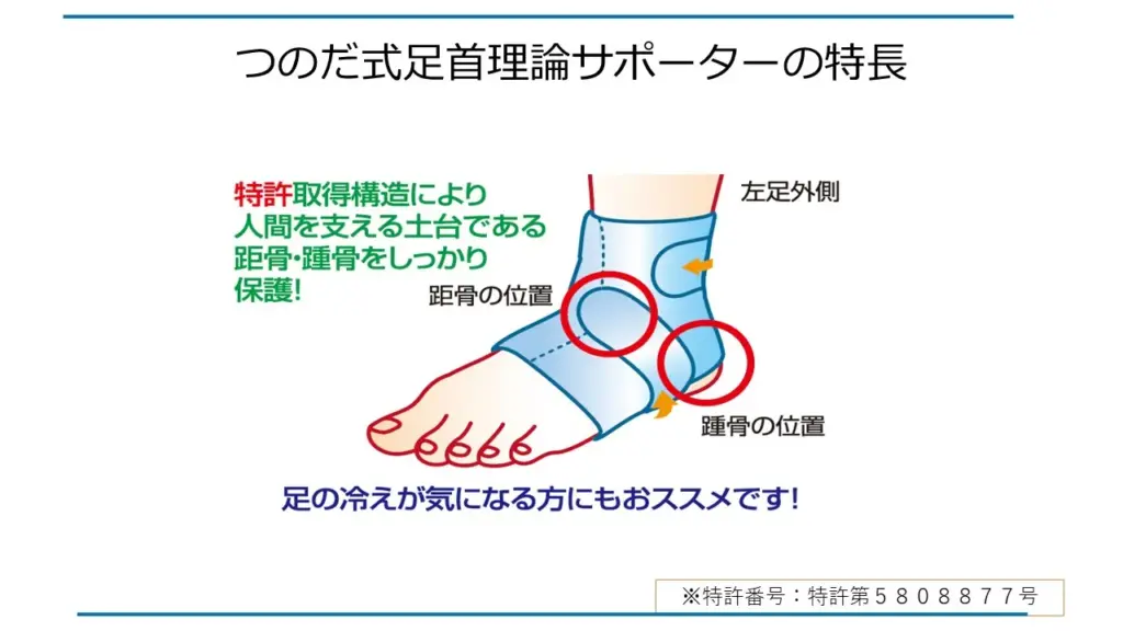 このサポーターは今までに注目されていなかった距骨と踵骨をポイントでしっかり守る事が可能となり、足の軸を整えてバランスを改善し、腰痛、膝痛、股関節痛やスポーツ能力向上を実現するものとなりました。